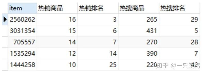 (select * from (SELECT item, COUNT(1) AS 热搜商品 ,row_number() over(order by COUNT(1) desc) as 热搜排名 FROM user WHERE behavior='pv' or behavior='fav' or behavior='cart' GROUP BY item) as A where A.热搜排名<51) as B