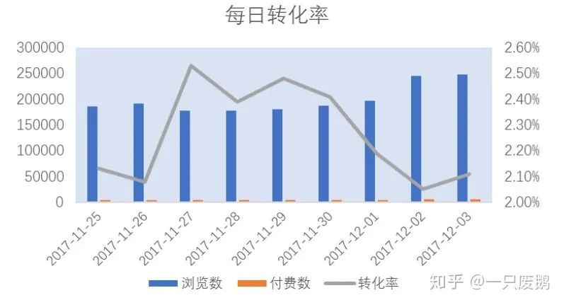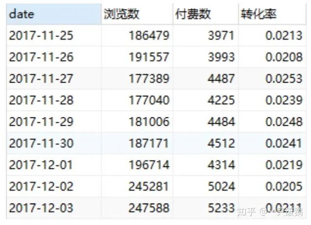 select date,浏览数,付费数,付费数/浏览数 as '转化率' from user_behavior