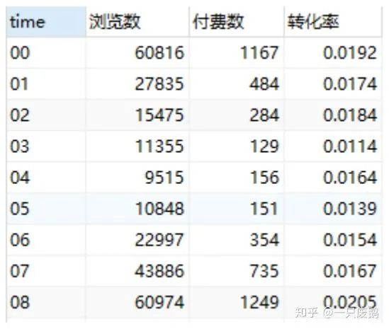 select time,浏览数,付费数,付费数/浏览数 as 转化率 from time_behavior;