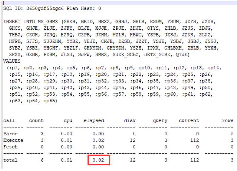 结果显示在跟踪时段内,一共解析与执行6次,总耗时0.02秒,进一步证实单独的插入过程在数据库内执行效率不存在异常。