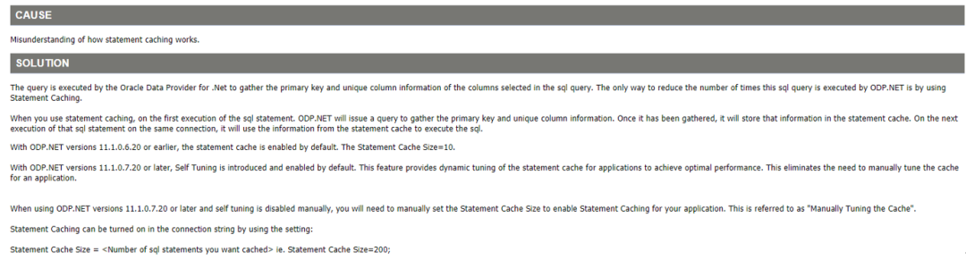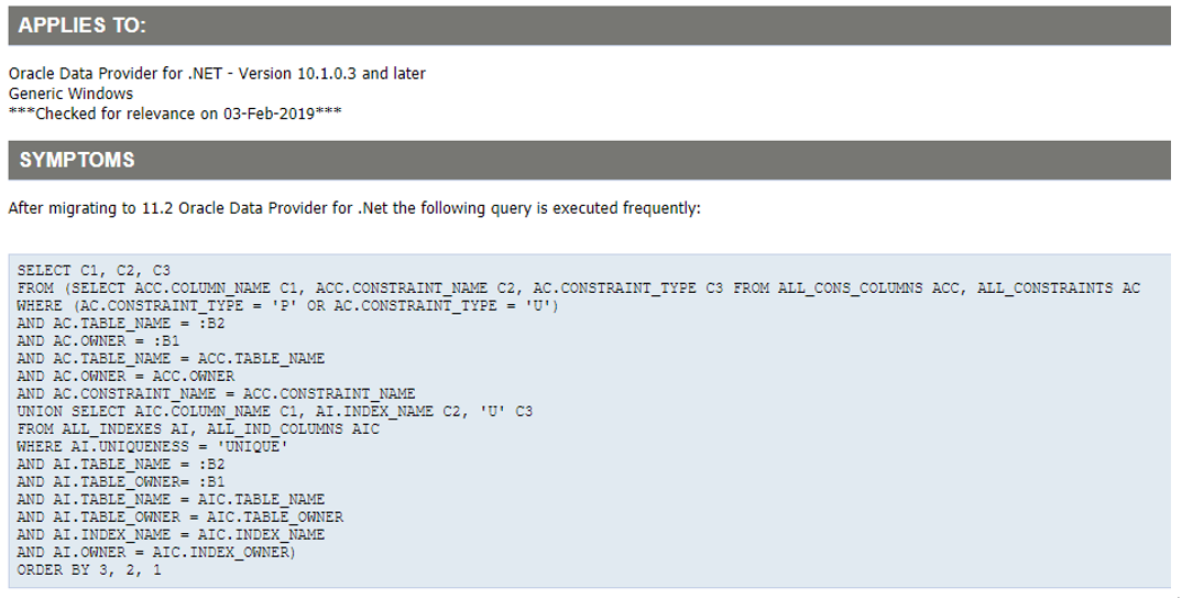 具体官方文档为Frequent Query on ALL_CONS_COLUMNS And ALL_CONSTRAINTS When Using ODP.Net Statement Caching (Doc ID 1386371.1),官方解释该语句确实为.NET自身发起,而非程序生成的语句。
