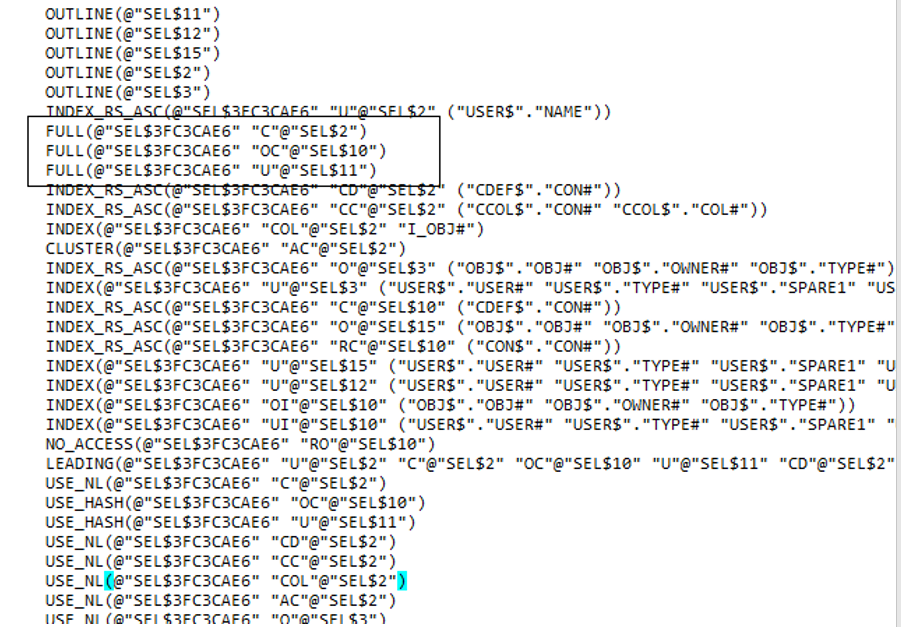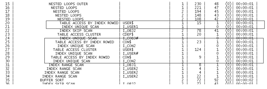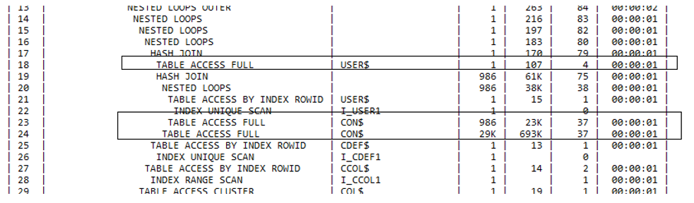 比较问题库和正常库两个基表all_cons_columns, all_constraints查询的执行计划,下图为有问题的数据库执行计划,走的是全表访问:
