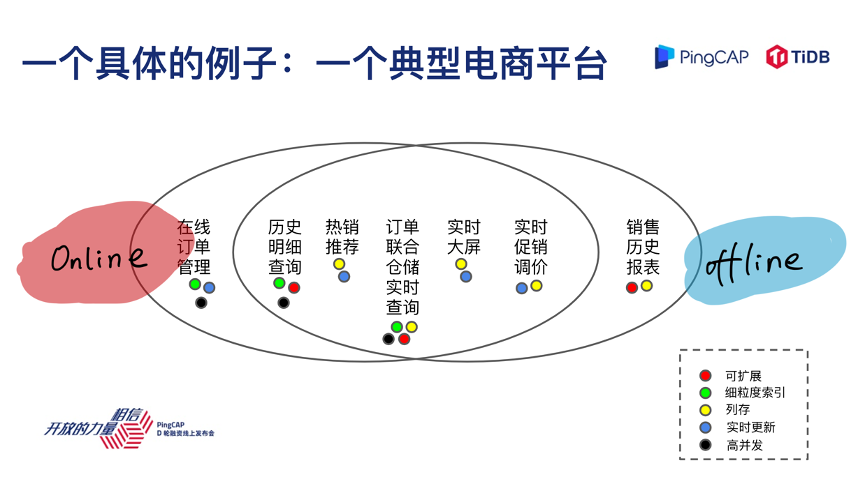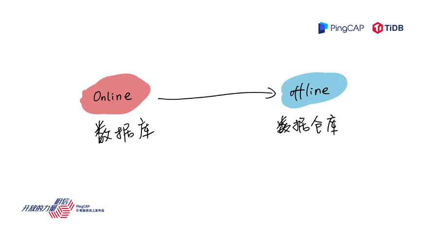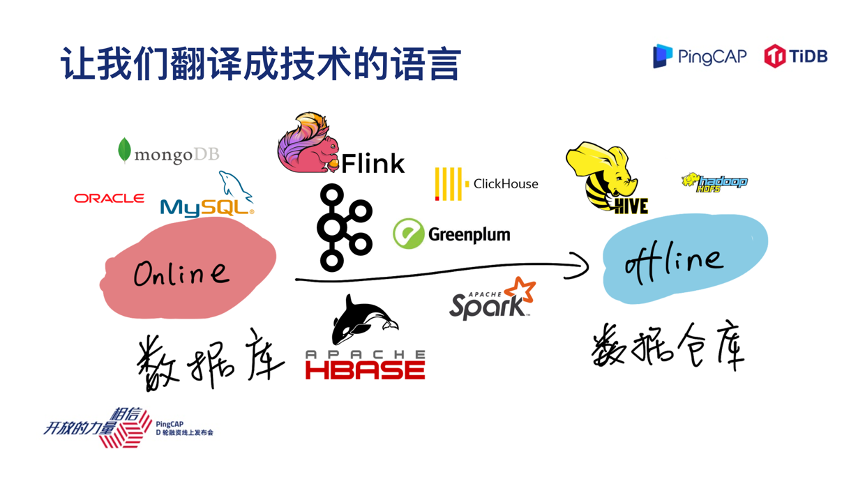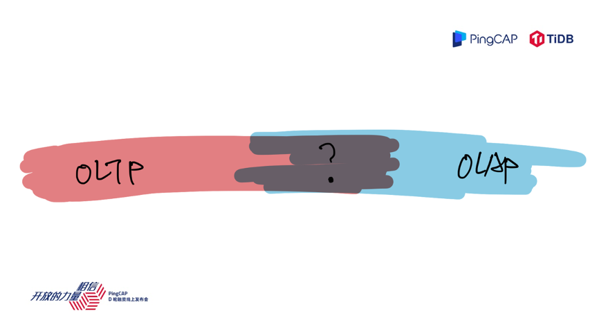 接下来进入正题,PingCAP 是做数据库的厂商,如果我们拉一条数轴来看,左边的业务是更偏实时在线的业务,如果这条数轴的右边是离线业务的话,按照这个数轴来看,数据库这个产品大家可能印象中是在左边的,一些典型场景,比如像 Hadoop 或者一些数据仓库、报表是在右边。