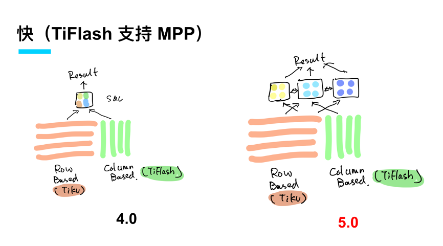 快的另外一个方面,首先熟悉 TiFlash 的同学看到标题肯定会心一笑,我们之前有提到 TiDB 是一个 Real-Time HTAP 架构,AP 这部分是由 TiFlash 分析加速引擎来提供服务的。在 5.0 里面 TiFlash 将支持分布式的聚合和分布式的计算(MPP),能让整个 TiDB 的 OLAP 能力真正延伸到更多的应用场景,应对更多更复杂的 JOIN 场景。