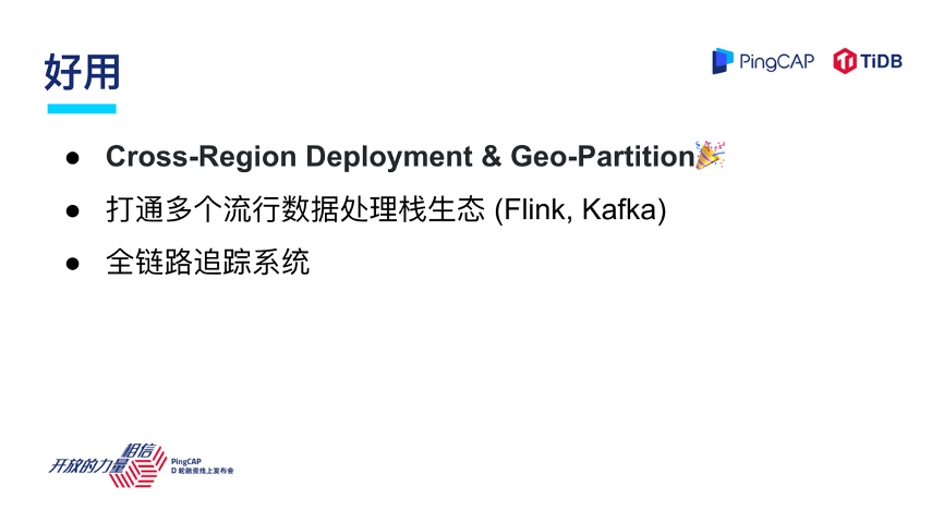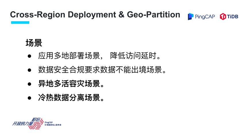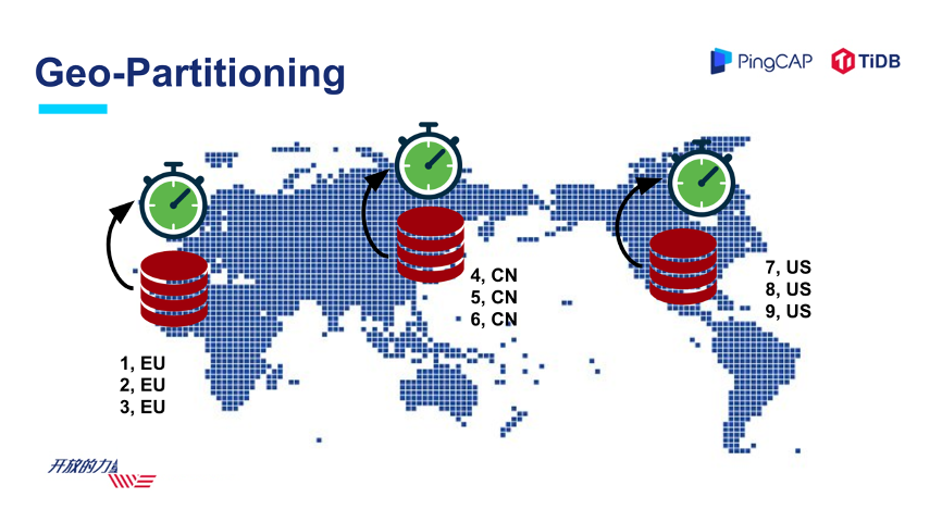 举个例子,我们刚才提到多地部署,怎么降低本地的延迟,如果是一个欧洲公司,大家知道欧洲有很严格的 GDPR ,企业的数据不能出境,这种场景下 Geo-Partition 就是一个非常实用的特性。