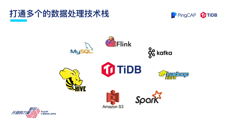 现在对于 TiDB 来说,已经能够与 Flink、Kafka、Spark,包括 Hadoop、AWS S3 以及 MySQL、Oracle 这些传统的数据库进行互联互通。
