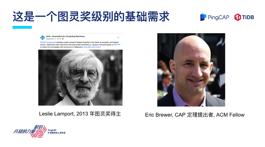 这里有两位行业泰斗级的人物,左边 Leslie Lamport 在 2013 年研究相关问题拿了图灵奖,右边这位跟我们挺有缘的,发型跟(我们的 CEO)刘奇同学挺像,他是 UC 伯克利分校的一名教授,也是著名 CAP 定理的提出者,PingCAP 中的 CAP 就是来源于此。虽然看上去这个需求是一个很朴素的需求,但是这是一个值得去花很长时间研究,在技术领域很有挑战,也是一个很前沿的研究领域。
