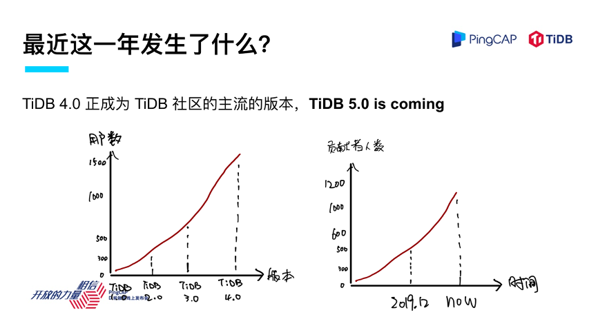 讲到 TiDB,我其实很感慨,我一直看着这个产品一步步成长起来,最近这一年成长速度尤其快,现在我很高兴地看到 TiDB 4.0 已经成为社区的一个主流版本。