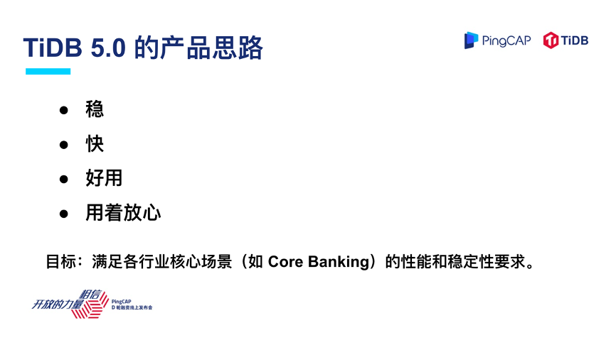 我想跟大家展望一下 TiDB 5.0,在讲 5.0 之前我想稍微强调一下 TiDB 做产品的思路。我们都是工程师出身,也比较接地气,不说什么高大上的,用大白话来说就四点:稳、快、好用和用着放心。前面提到过用户对于一个数据库产品的朴素需求,我们也是希望按照这种方式来做产品。