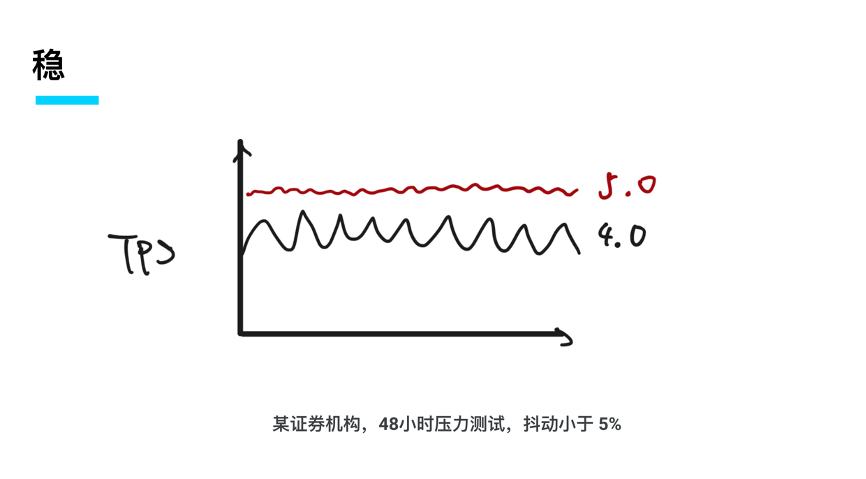 下图是 5.0 在某个券商机构的测试结果,在 48 小时高压力的测试场景里面 TiDB 5.0 的系统抖动一直小于 5%,同时在性能上跟 4.0 相比有明显的提升。我想强调的是在做稳定性这件事情上,已经开始进入改革深水区,低垂的果实已经摘的差不多了,剩下就是一些场景和技术上比较硬的难题等着我们去攻克,我们很高兴地看到 5.0 对于 4.0 在稳定性上有比较出色的表现。
