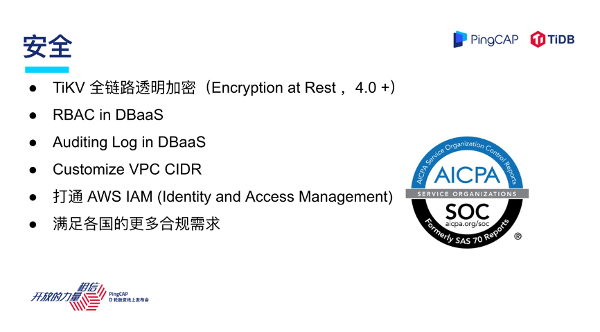 我想强调,在 4.0 里面 TiKV 存储层已经支持全链路的数据透明加密。在 DBaaS 平台里面,我们正在引入 RBAC,就是基于用户身份的鉴权系统,同时我们会跟 AWS 的身份认证系统进行打通,给用户提供更加安全、更加可靠的产品与服务保障。