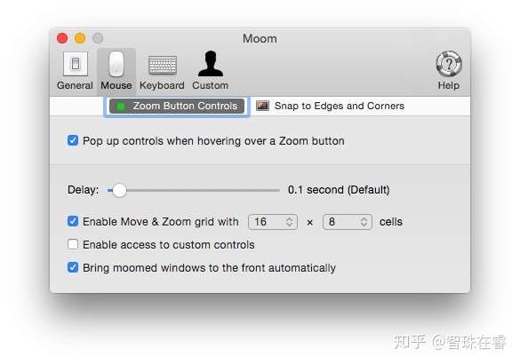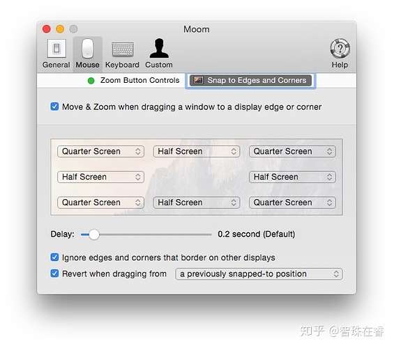 Ignore edges and corners that border on other displays:如果您的电脑配备有多块显示器,那么打开该功能,Moom 的 “自动缩放“ 则只会对当前的主屏幕有效,而不会影响到剩余的附加屏幕。Revert when dragging from **** :当使用 “自动缩放” 功能将窗口排列至对应的位置时,窗口尺寸会随着预设项重置,该功能则会帮助您恢复尺寸大小,不过前提是窗口必须离开 Moom 自动校准的位置。
