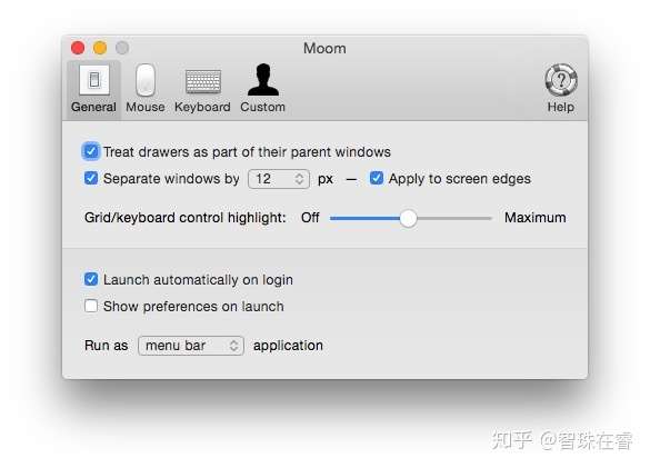 Treat drawers as part of their parent windows:这是的 Drawer 类似于附加窗口,附着在主窗口的左右,可以动态地显示或收起。因为 Drawer 显示和隐藏时,需要占用屏幕空间,因此这个选项就是定义是否将 Drawer 的尺寸于主窗口一同计算。Separate windows by **** px: 窗口与窗口,以及窗口与屏幕边缘间的默认最小距离。当您通过 Moom 将几个窗口分别放置在上下位或左右位时,窗口之间的距离大小则需要您手动调节。小编设置了12像素,效果可以看文章开关那张图。