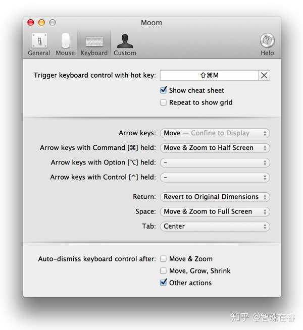 软件默认的键盘快捷键不光可以基于 CMD 键,您也可以赋予 Option 和 Control 键功能以最大化利用 Hotkey 功能。要是嫌麻烦或希望能自由配置,那您一定不能错过 Moom 开发商留下的 “自定义键盘快捷键” 功能。