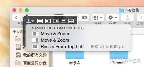 Moom能够快速修改当前窗口大小并放置在指定位置,它默认操作点设立在了窗口左上角的绿色按钮上,我们只需要将鼠标移动到绿色按钮上就会弹出一个选择菜单,里面有五种尺寸可选,单击选项即可变化窗口大小,并能将窗口移动到指定位置。