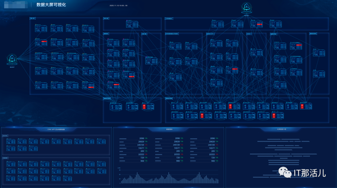 系统监控清晰透明:构建包含各应用模块上下游调用依赖关系(应用包括:业务应用、中间件、数据库等)、应用模块主机网络之间相互部署依赖关系的多维度关系图谱监控大屏,实现系统从黑盒状态到透明状态的转变。