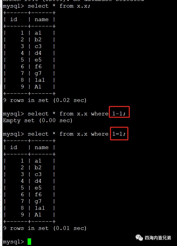 6、由于疏忽漏写,基于刚才的大家知道select * from t where 1是全部,0是什么都不做。