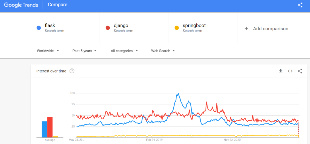 下图代表 Google 搜索走势,黄色:springboot,蓝色:django,蓝色:flask。flask 和 django 走势基本一致,受欢迎程度较高。