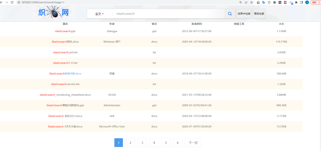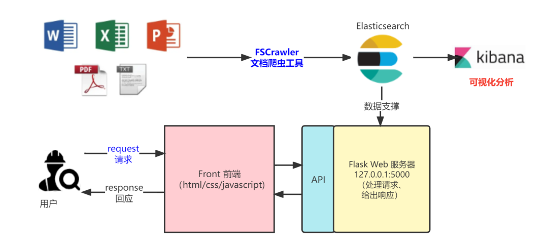 相比于之前 java 开发的 web 系统,这次是我全栈实现,涉及到技术包含但不限于:Html、CSS、Javascript、Python、Flask、Elasticsearch、Kibana、FSCrawler。