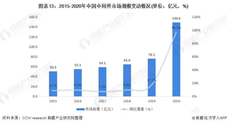 基于此,前瞻对中国2019-2020年中间件市场规模进行了填补。统计数据显示,中国中间件行业市场规模呈现逐年上升趋势,在信创产业建设概念提出前,中国中间件市场规模保持8%左右的增长率稳定增长,2020年其增长速度较快,达到96.4%,市场规模达到149.6亿元。