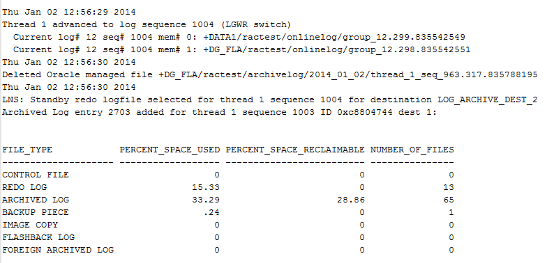 多次执行上述代码,发现FRA(快速恢复区)的空间使用率基本上在80%左右。alert日志也有相应的删除较早的归档日志的信息: