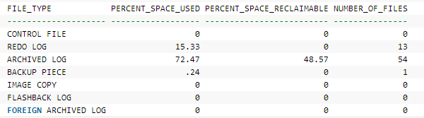 从上面的最后一次对v$recovery_area_usage的查询数据可以看到,此时空间利用率达到了94.19%,离95%已经很接近(在线日志的大小是512MB,占快速恢复区的3.1%,如果在快速恢复区里面多一个文件就会超过95%)。