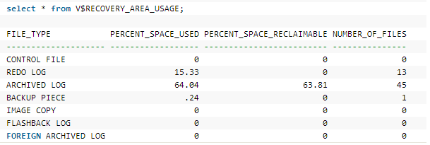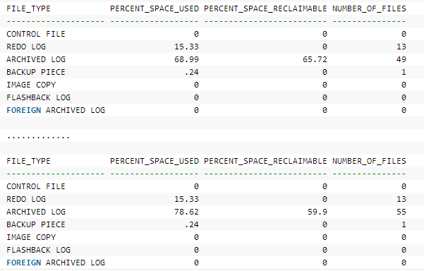 (2)将这个大小与当前的占用空间大小相加,看是否超过了80%,如果超过了,那么就回收空间(回收的空间应大于等于新建文件需要的空间大小,也就是回收的空间以够用为原则)。如果不能回收空间(比如归档日志没有被应用到备库),那就只能继续占用新的空间,直到空间耗尽。