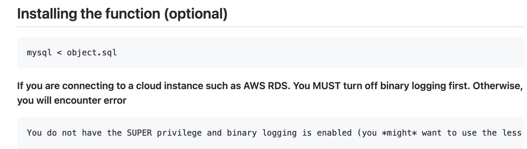 毕竟样例数据库之后我们自己的同学也会使用,所以为了知行合一,防止同学们的脑裂,也就把样例数据库的表名都改成了单数。既然改变了表的名字,就需要重新生成 Schema 图示,顺手也把本来仓库里缺失的 View 的定义也加上了。我用的是 phpMyAdmin,因为图上的连接线是自动生成的,所以为了摆出一个看起来清晰的 schema 图,还花了一点时间。有些文件其实已经不起作用了,就删除掉了。同时也把 SHA 的导入数据验证方式给删了,只留了 md5 的。这么做也是为了降低认知成本。因为创建了两套数据集,所以表结构的文件是会重复的。最终还是选择了保留重复,分别放在两个目录下。原因是为了让一个目录下的内容形成闭环 (self-contained)。因为有可能用户只需要其中一份,比如那份小的数据集就可以了。我在本地和 AWS RDS 对两份数据集按照修改后的 README 进行了测试,确保用户可以按照 README 完成。确实也发现了一个 AWS RDS 导入 Function 的问题。所以也在 README 上注明了。云上数据库从云服务商安全性和管控性的角度考量,都会把数据库的超级用户以及其他一些功能给去掉,这往往会导致一些兼容性的问题,所以需要单独进行测试。