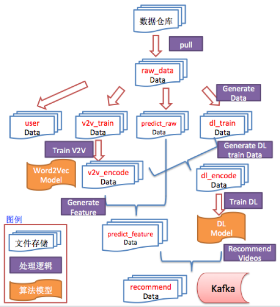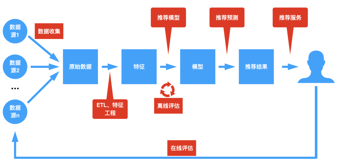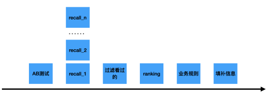 id,这时如果推荐系统有AB测试的话,需要先获得用户的AB测试分组信息(AB测试中不同的组会用不同的召回、排序算法,AB测试的目的就是评估各个算法的效果),然后基于基于用户的分组去获得该用户的召回结果(即图中的recall_1、recall_2、... 、recall_n等),召回之后我们会过滤掉用户操作过的物品然后进行排序(即图中ranking),之后是一些业务规则(比如新闻资讯APP中会对某些新闻置顶等),然后是填补物品需要展示的metadata数据,最终将推荐结果在前端展现给用户。