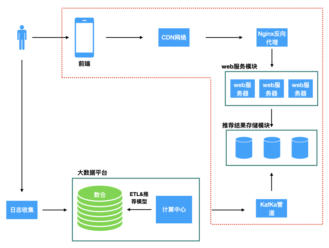 UI上使用推荐系统时,触发推荐Web接口服务(比如用户在抖音上刷,参见下面图4中的web服务模块),为用户提供个性化推荐,该模块的稳定性、响应时长直接影响到用户体验。跟上面的推荐存储模块类似,Web服务模块也需要支持高并发访问、水平可拓展、亚秒级(一般200ms之内)响应延迟。我们会在第17章中详细介绍推荐Web服务相关的知识点,这里不再赘述。