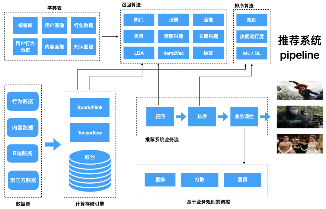 (即所谓的CTR预估,也可以是预测用户的停留时长,具体用什么指标作为目标需要根据业务来定)。在实际业务中,在排序后还会增加一层调控逻辑,根据业务规则及运营策略对排序后的列表进一步增补微调,满足特定的运营需求。我们会在本书的第三篇(6~9章)和第四篇(10~12章)分别讲解各种召回、排序策略,这里不赘述。