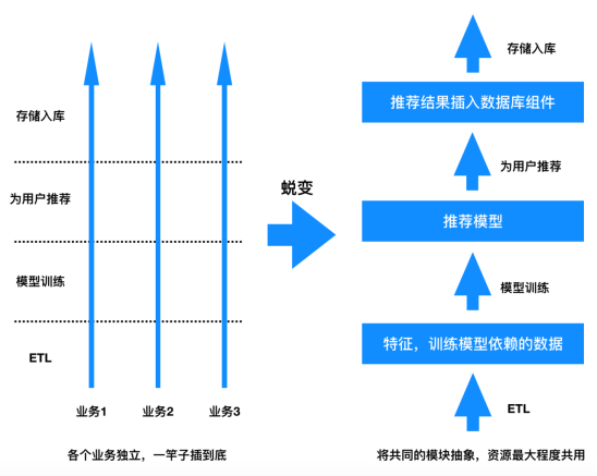 (一个推荐业务对应一个推荐产品形态),由于每个人只对自己的业务负责,所以开发基本是独立的,每个人只关注自己的算法实现,虽然用到的算法很多都是一样的,但前期在开发过程中没有将通用的模块抽象出来,每个开发人员从ETL、模型训练、推荐预测、推荐结果存储、推荐web服务都是独立的,并且每个人在实现过程中整合了自己的一些优化逻辑,一竿子插到底(即所谓的烟囱式架构),导致资源(计算资源、存储资源、人力资源)利用率不高,开发效率低下,代码也极难复用。下面图7就是这两种设计方案的对比。