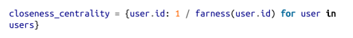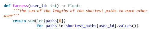 我们可以看到的另一个衡量标准是紧密关系的中心性。首先,我们为每个用户计算她的距离,即她对彼此用户的最短路径长度的总和。由于我们已经计算了每对节点之间的最短路径,因此容易添加它们的长度。(如果有多个最短路径,它们都有相同的长度,所以我们可以只看第一条。)