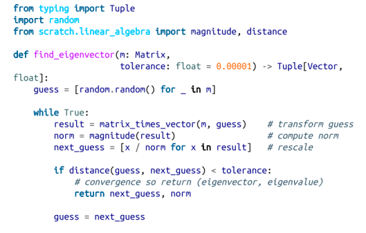 对于任意向量 [x, y],这个矩阵都会将其映射为 [y, x]。这就意味着,[1, 1] 是一个特征值为 1 的特征向量。但是,如果你从一个 x 和 y 并不相等的随机向量着手的话,那么,find_eigenvector 将会来回交换这两个坐标值,并且永远也不会停下来。(Not-from -scratch 是一个类似于 NumPy 的 Python 库,由于它采用了不同的处理方法,因此能够有效处理这种情形。)尽管如此,只要 find_eigenvector 能返回一个结果,那么这个结果肯定是一个特征向量。