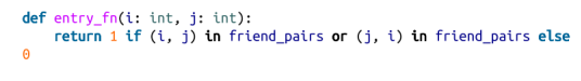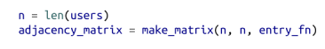 首先,我们需要用 adjacency_matrix 来表示网络中的连接,其中第 (i,j) 个元素的值要么为1(如果用户 i 和用户 j 是朋友的话),要么为 0(如果他们不是朋友的话)