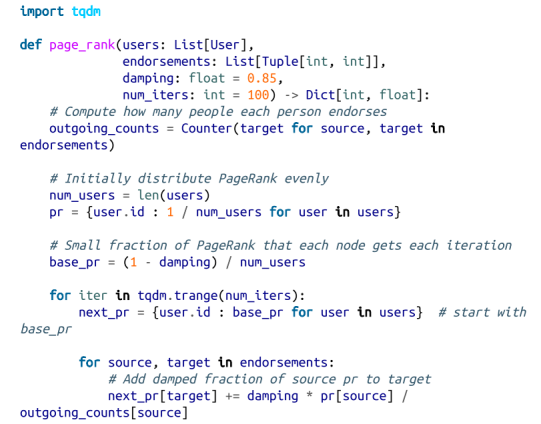 虽然它背后的数学一开始看起来有些不透明,但计算本身相对简单(不像中间中心性),即使是在非常大的图上也很容易执行。(至少,如果使用真实的线性代数库,则很容易在大型图上执行。如果你使用我们的列表实现,你会很困难。)