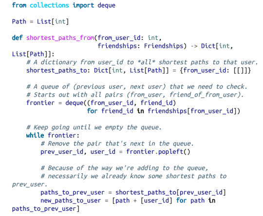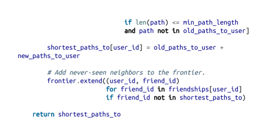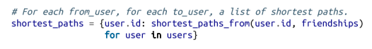 3. 我们将维护一个名为 shortest_paths_to 的字典,其键为用户 ID,其值为以该用户 ID 结尾的路径构成的列表。如果最短路径是唯一的,那么这个列表就只包含一个路径。如果有多条最短路径的话,那么该列表将包含所有这些路径。