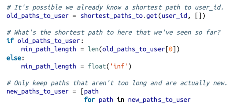 6. 当我们把一个用户从队列中删除时,如果之前从未遇到过该用户,那么我们肯定是找到了一个或多个通向它的最短路径:沿着到达 prev_user 的每个最短路径再走一步即是。