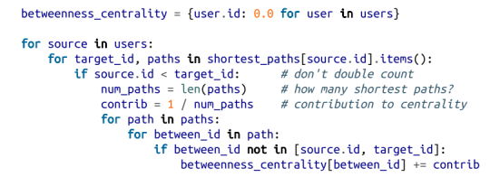 因此,作为第一步,我们需要找出所有用户对之间的最短路径。不过,尽管存在许多可以高效计算最短路径的尖端算法,但是按照我们的惯例,这里将采用效率虽低一些但更加容易理解的算法。