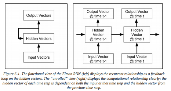 循环神经网络(recurrent neural network,RNN)的目的是建立张量序列的模型。RNN和前馈网络属于一类模型,RNN 家族中也有几个不同的成员,但在本章中,我们只讨论最基本的形式,有时称为 Elman RNN。循环网络(包括基本的 Elman 形式以及将在第七章中概述的更复杂的形式)的目标是学习序列的表示,这是通过维护一个隐藏状态向量来实现的,它捕获了序列的当前状态。隐藏状态向量由当前输入向量和前一个隐藏状态向量计算得到。这些关系如下图(6-1)所示,它展示了计算依赖项的函数视图(左)和“展开(unrolled)”视图(右)。在两个图例中,输出和隐藏向量一样,但并不总是如此,只是在Elman RNN中,这个隐藏向量是被预测的东西。