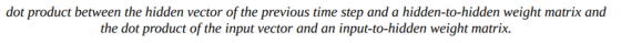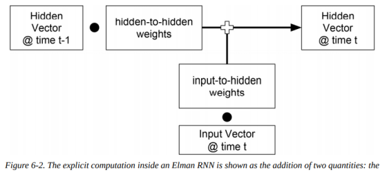 让我们看一个更具体的描述,以了解Elman RNN中发生了什么。如上图(6-1)中展开的视图所示,也称为时间反向传播(backpropagation through time,BPTT),当前时间步的输入向量和前一时间步的隐藏状态向量被映射到当前时间步的隐藏状态向量。如下图(6-2)所示,使用hidden-to-hidden权重矩阵来映射之前的隐藏状态向量,并使用input-to-hidden权重矩阵来映射输入向量,从而计算新的隐藏向量: