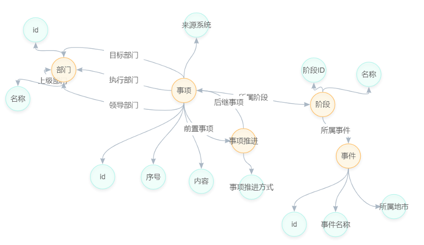 构建应急预案知识图谱首先需要对知识图谱架构(Schema)进行设计,本应用构建了基于“事项-阶段-部门”为核心的知识图谱基本架构,知识图谱Schema如下图所示。