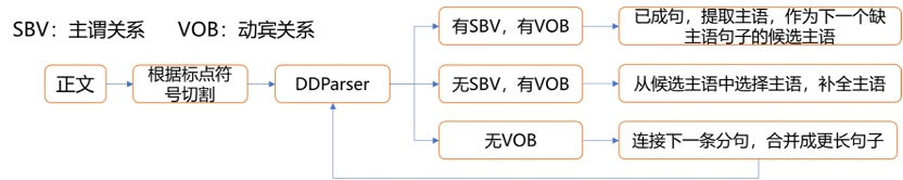 主要是对分好的段落进行分句,采用百度中文依存句法分析工具(DDParser),分析句子中词与词之间的依存关系(如主谓关系指主语与谓语间的关系),并根据依存关系以及标点符号进行自动切分。切分后,还要再判断句子中是否存在并列关系或连谓结构,这样的句子一般是在同一事项当中,所以再对相应句子进行合并。