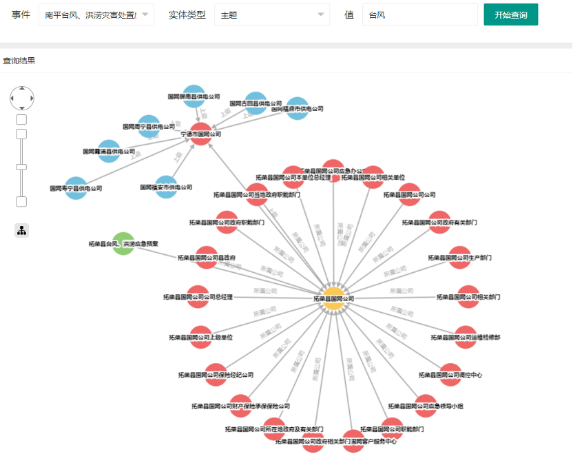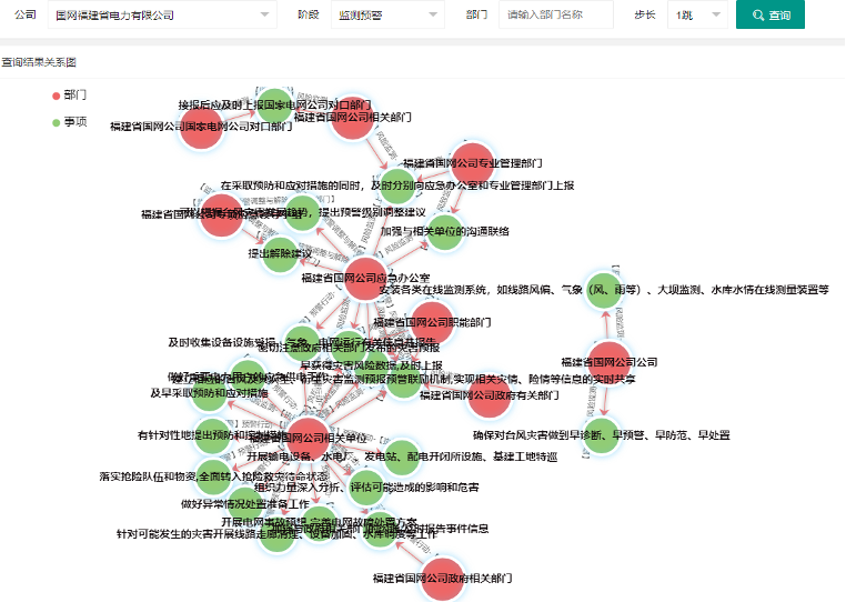 我们采用大数据、深度学习、自然语言处理等技术对应急预案、工作手册等规范化文件进行识别与解析,抽取其应急预案中涉及的主体、事项等信息,并转化成RDF知识图谱数据,最终构建应急指挥知识图谱。并通过知识图谱的关联分析,直观展示各个部门在面对某个自然灾害时,其处置方案和处置流程等,从而使得应急预案更直观。