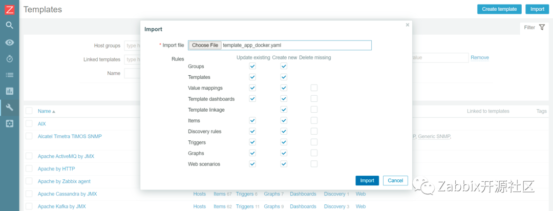 因为要使用官方模板Docker by Zabbix Agent2。首先,我们需要确保这个模板在 Zabbix 中是可用的。*Zabbix 5.0、5.4和6.0**中都提供了该模板。如果你在 *配置->模板 中没有找到这个模板,很有可能是你在升级完Zabbix版本之后,没有将它导入到你的环境里。请记住,Zabbix 在升级过程中不会修改或导入任何模板,因此我们必须手动导入模板。这样的话,只需要从官方Zabbix git(或者直接点击这里)下载并通过使用 配置->模板 页面中的 Import 按钮将其导入到 Zabbix 实例中。