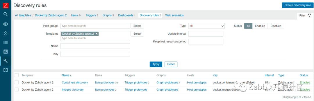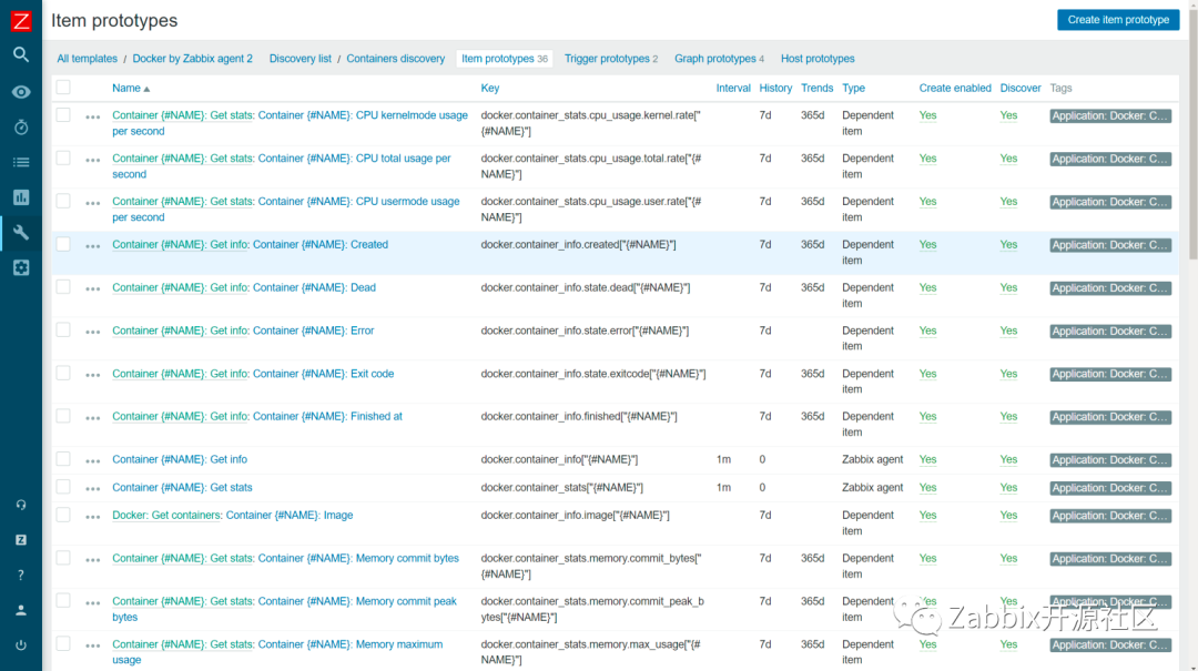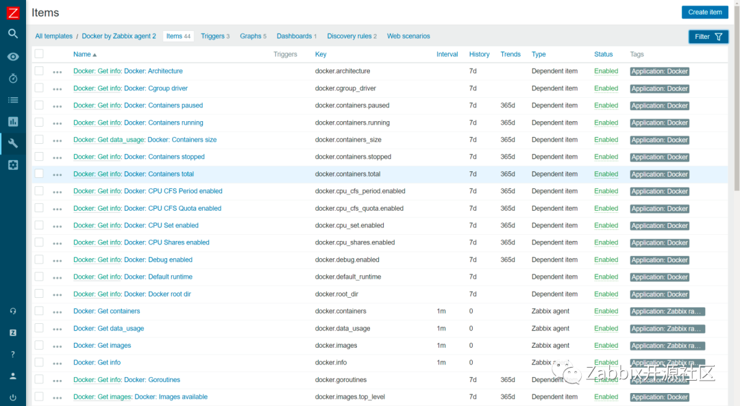 docker.containers.discovery[false] – 只发现正在运行的容器 docker.containers.discovery[true] – 发现所有容器,不管是什么状态。