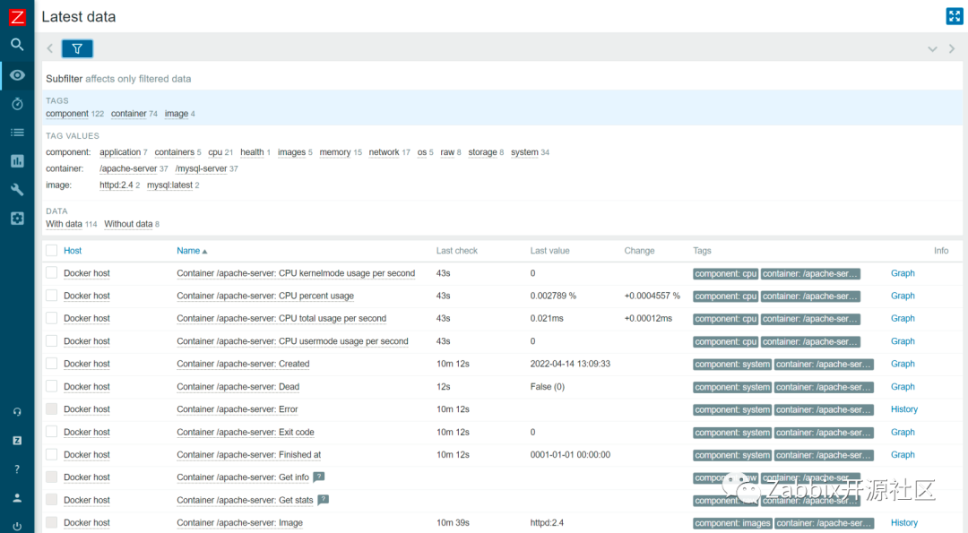 我们可以看到 Zabbix 将发现并监控两个容器—apache-server and mysql-server。任何代理的LLD(低级别发现)规则或监控项都可以用 zabbix get 进行检查