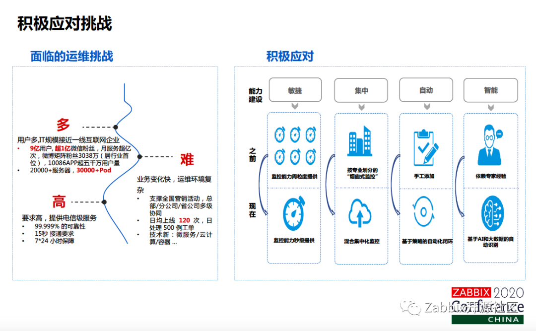 大家可以看到,现在线上生产环境的容器已经有3万+了,物理机也有2万多台,业务系统也是变化很快的,采用了很多新的技术,比如说微服务、容器,日均上线是120次,这在传统的运营商里面是非常庞大的数量了。最后就是要求高,很难想象,如果10086电话打不通了,可能这个事就要上新闻了。