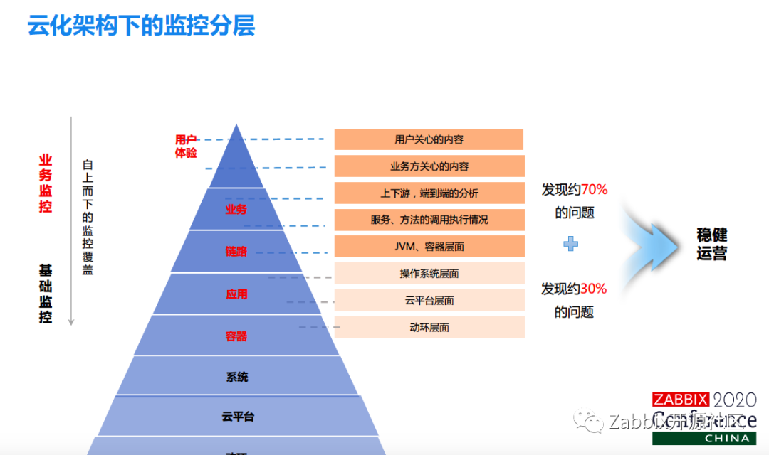 这时候又有一个问题了,老板说什么时候是个头呢,你怎么能告诉你的老板,我现在已经能把加的监控全部加完了。这个时候我们又做了一个事情,就是梳理了一下云化架构下我们认为的监控分层,以及每一层都应该涉及到的监控指标,就是这个金字塔型结构。这个时候我们就会发现,其实业务监控能发现70%的问题,基础监控可能只能发现30%的问题,所以会把更多的经历投入到了在业务监控方面的添加。