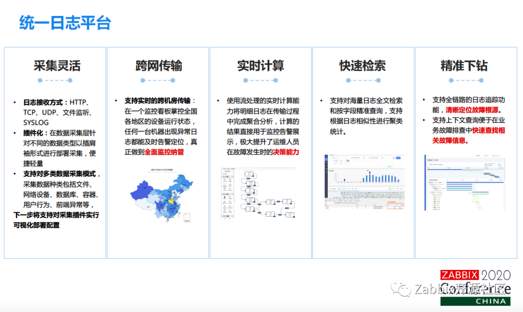这是我们的统一日志平台,采集的方式有很多种,包括HTDP、TCP、UDP、文件监听、SYSLOG的。另外,我们也做跨网传输,刚才讲了我们有31个分公司,有31个边缘节点,所以要把分公司的日志全部传到本部的平台上面来,也用了Flink实时大数据的计算能力,把日志汇聚在一起,最后也实现了,通过全局的唯一追踪ID,实现了业务系统日志里面的上下文的查询,以及全链路的调用链的分析。